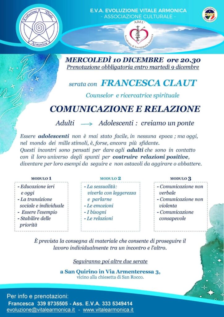 – infine, le basi di una relazione sana ed equilibrata si fondano sulla comunicazione. Vedremo piccoli spunti sulla comunicazione non violenta, la comunicazione consapevole, su come il nostro corpo e la nostra energia comunicano prima delle parole, e come utilizzare al meglio uno strumento potente come la parola.
